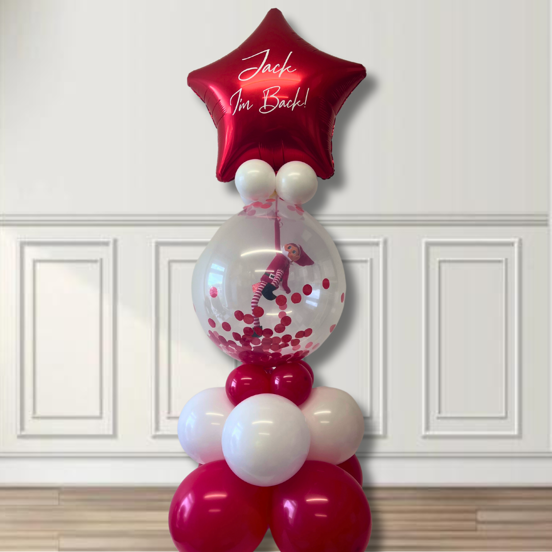 1 x Clear 18" latex balloon stuffed with shredded paper and your Elf hanging, all on a base of latex balloons and a customised star on top, ready to be popped and freed.