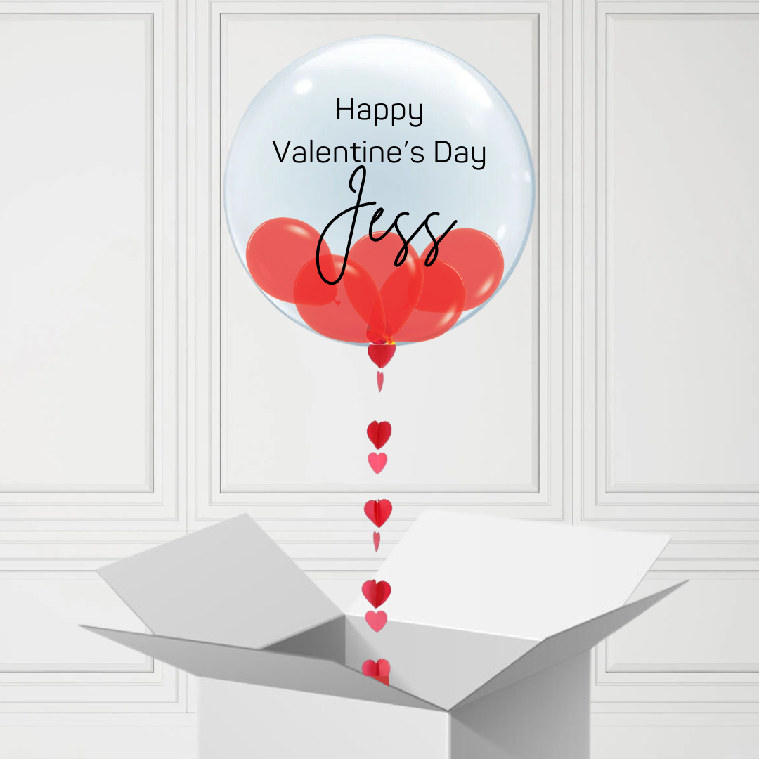 1 x Clear Bubble Balloon filled with mini balloons in a couple of colour choices helium filled, attached a heart ribbon, all placed inside a white box. Custom printed with any wording of your choice. (Product may differ slightly from image) Also an option to add 20 x AIR FILLED latex balloons in colours to match to be scattered onto the floor.